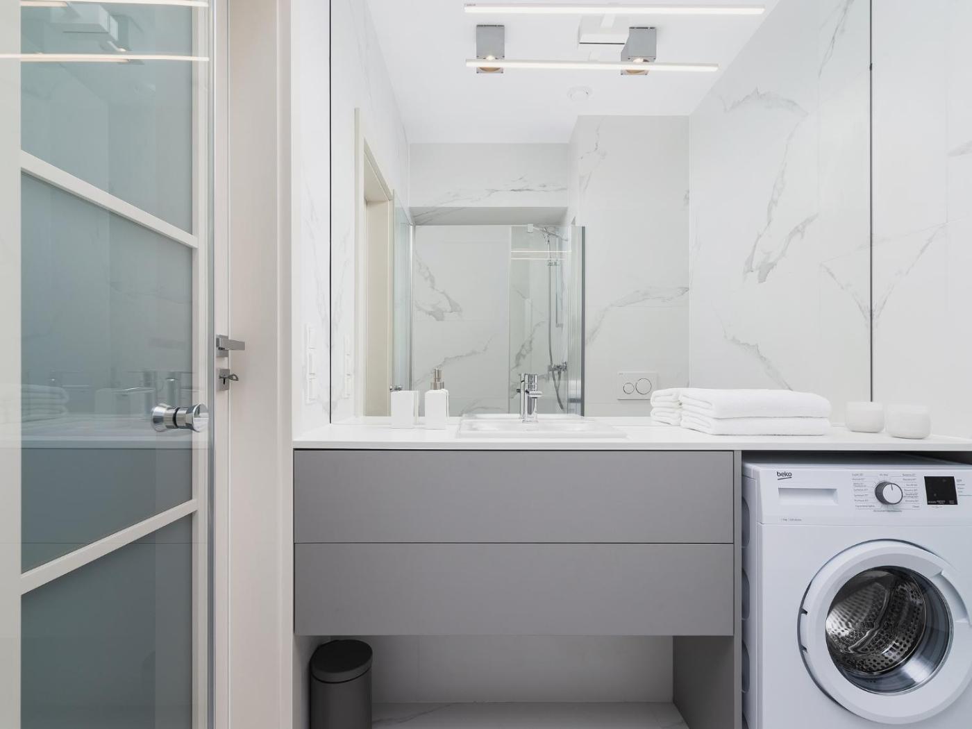 W apartamencie zapewniono sypialnię (1), kuchnię z lodówką i piekarnikiem, a także łazienkę (1) z prysznicem, suszarką do włosów oraz pralką. W apartamencie zapewniono ręczniki i pościel.