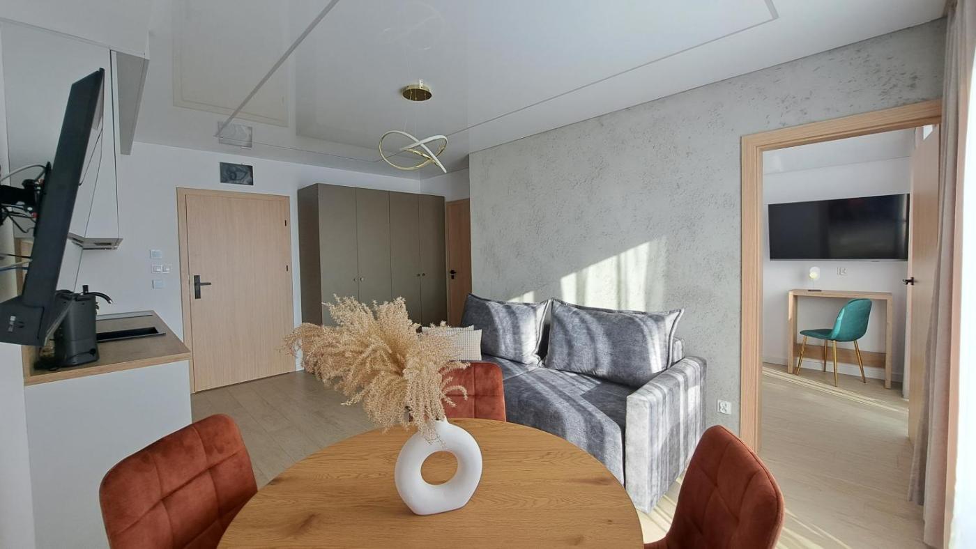 Apartament typu studio. This apartment consists of 1 living room, 1 separate bedroom and 1 bathroom with a shower and free toiletries. Guests can make meals in the kitchenette that is equipped with a stovetop, a refrigerator, a dishwasher and kitchenware. This apartment features air conditioning, a tea and coffee maker, flat-screen TV, as well as chocolate for guests. The unit offers 3 beds. Apartament - 4 osobowy. Powierzchnia pokoju ok.: 36 mkw. ;