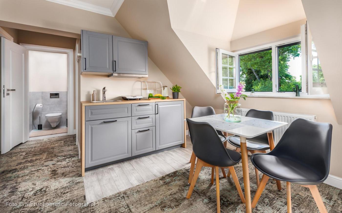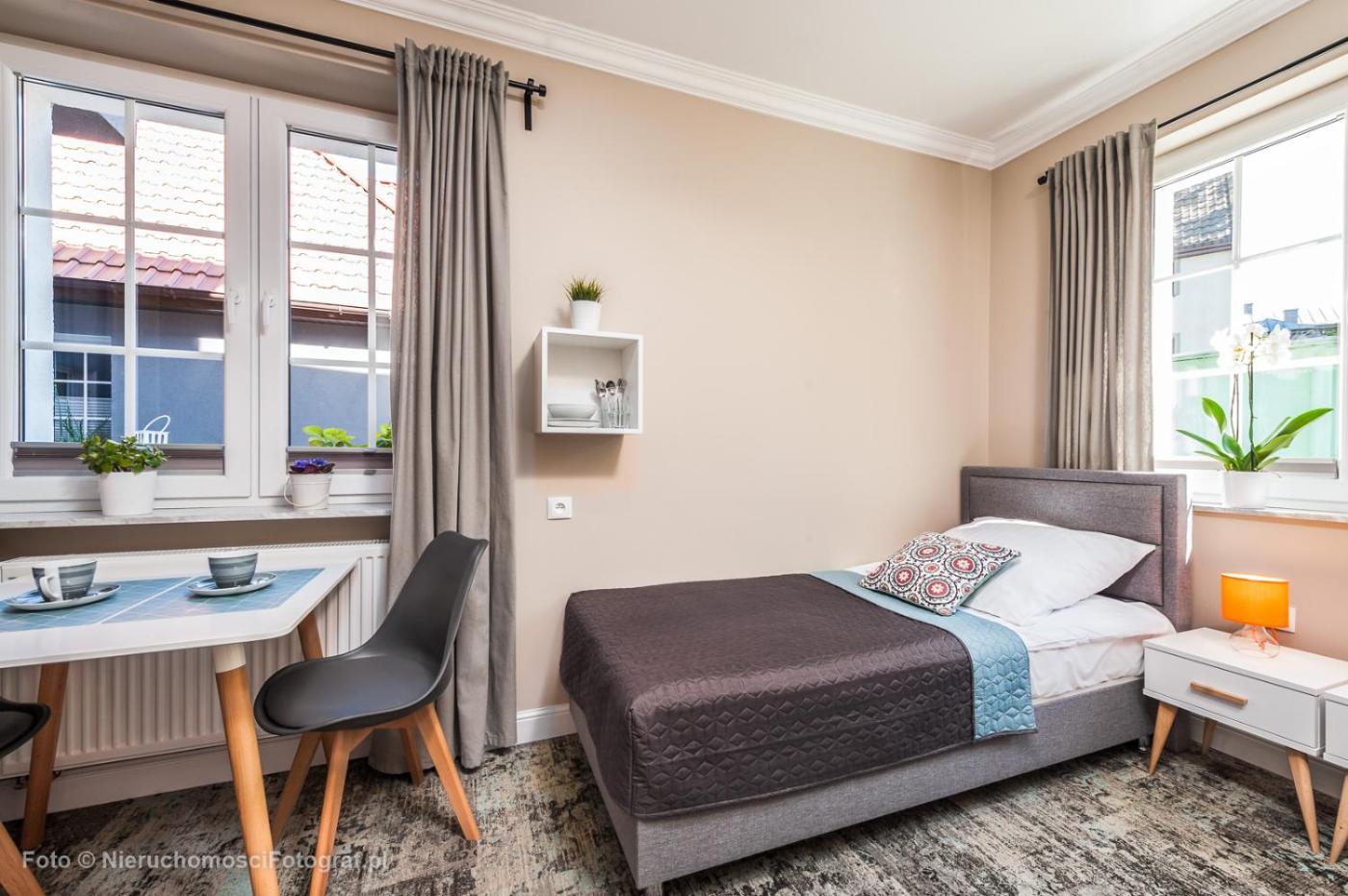 Apartament typu Junior Suite. This suite comprises 1 living room, 1 separate bedroom and 1 bathroom with a shower and a hairdryer. Meals can be prepared in the well-fitted kitchenette, which is equipped with a refrigerator, kitchenware, a toaster and an electric kettle. The suite features carpeted floors, a seating area with a flat-screen TV, a washing machine, a wardrobe as well as ancourtyard view. The unit offers 2 beds. Apartament typu Suite - 4 osobowy. Powierzchnia pokoju ok.: 25 mkw. ;